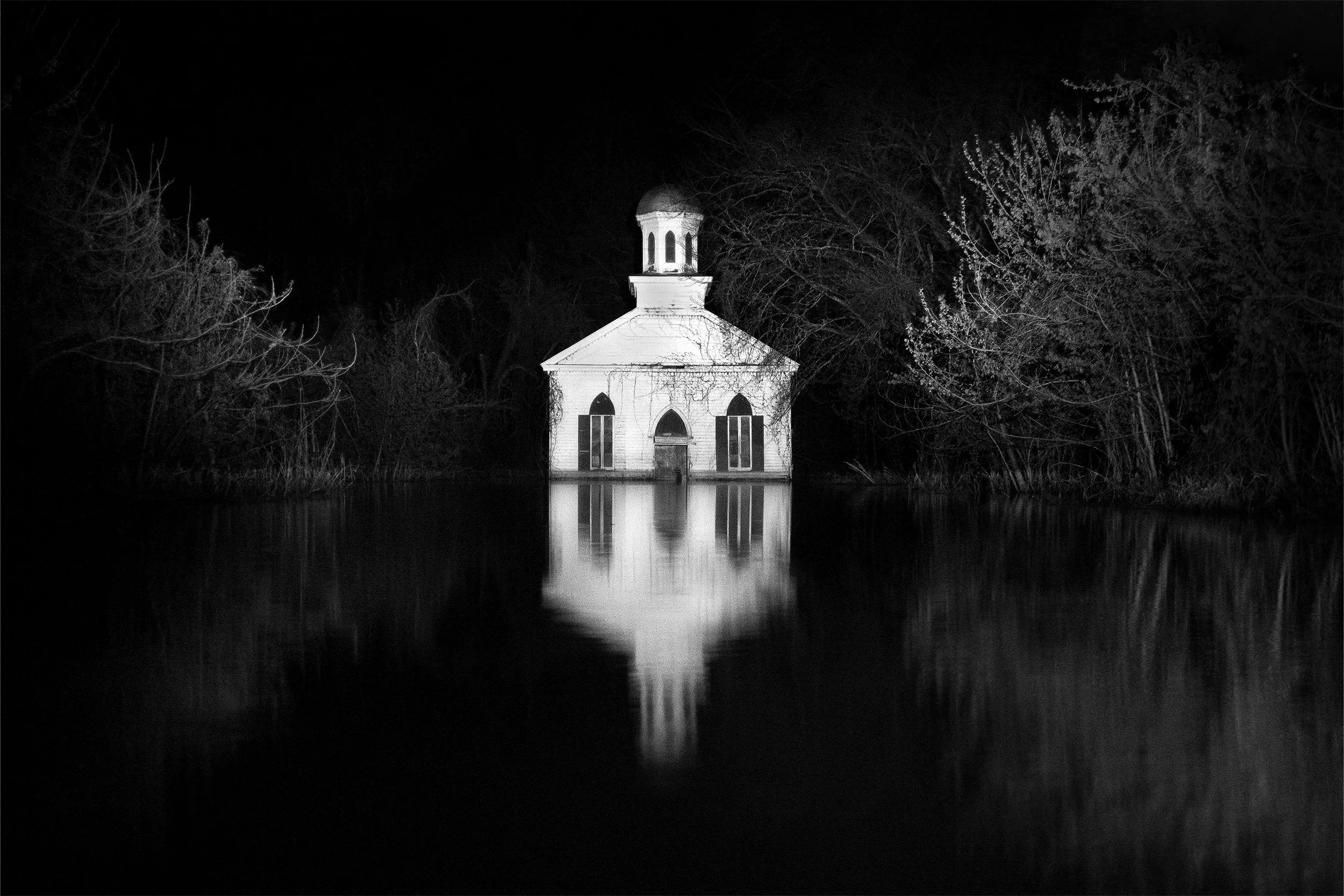 The series “Nature Vs. Nurture” is the result of a very impromptu adventure which the artist Wes Fowinkle (along with one very trusting family member) would find themselves waist deep in a swamp in the middle of the night searching for a flooded church with only headlamps and walking sticks to find their way. After driving hours in the night, down washed out country roads, and around a “Road Closed” sign, the dirt road they were traveling along simply turned to water. At this point they parked the car, donned fishing waders and headlamps, and entered the water to begin their search; it was sometime after 12am. After hours of uncertainty down unknown roads, and searching for the flooded church while waist-deep in the murky swamp, in the pitch black of night the ghostly structure finally appeared!